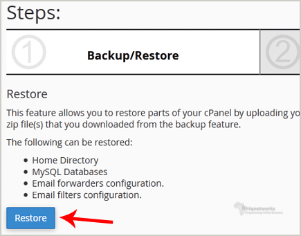 Knowledgebase Categories Backup/Restore 4 Broadband Internet 1 cPanel - Control Panel 24 Databases 11 Dedicated Servers 3 DNS - Nameserver 6 Domain 2 Domain Management 10 Domain Transfer 1 Email 13 FTP 4 Installing a Control Panel 6 Mail Filters & SPAM 8 Mobile 11 New Microwave Upgrade 1 Others 3 Security 10 Softaculous 71 Web Hosting 1 Wordpress 17 Categories Backup/Restore (4) Broadband Internet (1) cPanel - Control Panel (24) Databases (11) Dedicated Servers (3) DNS - Nameserver (6) Domain (2) Domain Management (10) Domain Transfer (1) Email (13) FTP (4) Installing a Control Panel (6) Mail Filters & SPAM (8) Mobile (11) New Microwave Upgrade (1) Others (3) Security (10) Softaculous (71) Web Hosting (1) Wordpress (17) How to Restore cPanel Backup? 1. Log into your cPanel account. 2. In the "Files" section, click on "Backup Wizard" Icon. 3. Under "Backup/Restore" text, click on the "Restore" button. 4. Under "Select Restore Type", choose the appropriate option.5. Click on "Browse", select your backup file from your PC, and click on the "Upload" button. Was this answer helpful? Yes No Print this Article Also Read How to Download Backup of Home Directory, MySQL or E-mail Only? 1. Log into your cPanel account.2. In the "Files" section, click on "Backup Wizard" Icon. 3.... How to generate and download a full backup of your cPanel Account? 1. Log into your cPanel account.2. In the "Files" section, click on "Backup" Icon. 3. Under "Full... How to generate a cPanel backup and sent to FTP Server? 1. Log into your cPanel account.2. In the "Files" section, click on "Backup" Icon. 3. Under... Powered by WHMCompleteSolution Support My Support Tickets Announcements Knowledgebase Downloads Network Status Open Ticket