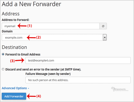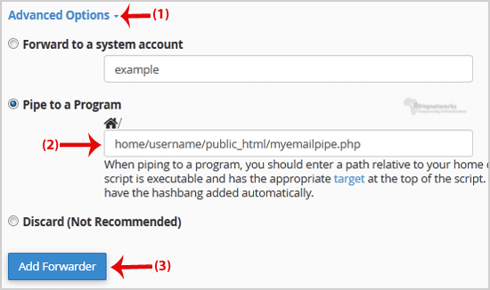 Knowledgebase Categories Backup/Restore 4 Broadband Internet 1 cPanel - Control Panel 24 Databases 11 Dedicated Servers 3 DNS - Nameserver 6 Domain 2 Domain Management 10 Domain Transfer 1 Email 13 FTP 4 Installing a Control Panel 6 Mail Filters & SPAM 8 Mobile 11 New Microwave Upgrade 1 Others 3 Security 10 Softaculous 71 Web Hosting 1 Wordpress 17 Categories Backup/Restore (4) Broadband Internet (1) cPanel - Control Panel (24) Databases (11) Dedicated Servers (3) DNS - Nameserver (6) Domain (2) Domain Management (10) Domain Transfer (1) Email (13) FTP (4) Installing a Control Panel (6) Mail Filters & SPAM (8) Mobile (11) New Microwave Upgrade (1) Others (3) Security (10) Softaculous (71) Web Hosting (1) Wordpress (17) How to forward email to Gmail, Yahoo or other e-mail service providers? Email Account Forwarders:Step 1: Login to your cPanel account.Step 2: In the "Email" Section of your cPanel, click on "Forwarders" and then click on "Add Forwarders". Step 3: On the "Add a New Forwarder" page you will see the "Address to forward:" field. If you want to forward your myemail@example.com to your custom e-mail address, enter "myemail" (without the quotes) in the "Address to forward" field, and should you have multiple domains, select the appropriate one from the domain drop-down list.Step 4: From the "Destination" field select "Forward to email address" and enter your custom e-mail address on which you want to receive forwarded emails.Final Step: Click on the "Add Forwarder" Button.How to forward email to a mail pipe script/program?1. If you want to forward your email to an e-mail pipe script like myemailpipe.php, which is located on your public html folder like "/home/username/public_html/myemailpipe.php", follow Step 2 and Step 3.2. In the "Destination" field click on "Advanced Options" to expand them, select "Pipe to a Program" and enter the full path of your custom email pipe script such as "home/username/public_html/myemailpipe.php" (Without the quotes, and you may have noticed that we do not use a slash at the beginning of the url.)3. Click on the "Add Forwarder" Button. Was this answer helpful? Yes No Print this Article Also Read How to create an E-mail Autoresponder when you are unavailable or on vacation? If you are going for a holiday or will be unavailable for few days or a month, you can create an... How to change the password of your email account? If you want to change password of your email account then you can do this by the following... Set Up E-mail in Microsoft Outlook In this tutorial, we shall use the domain example1.com with the email example@example1.com as an... Email Spam, Why is My Ip or Domain Blacklisted & How to stay safe Have you asked yourself what is spam, how it happens, why you get Blacklisted and its... How to Access your Email Account from cPanel Webmail? You can access your Email account directly from Webmail.1. Open http://example.com/webmail,... Powered by WHMCompleteSolution Support My Support Tickets Announcements Knowledgebase Downloads Network Status Open Ticket