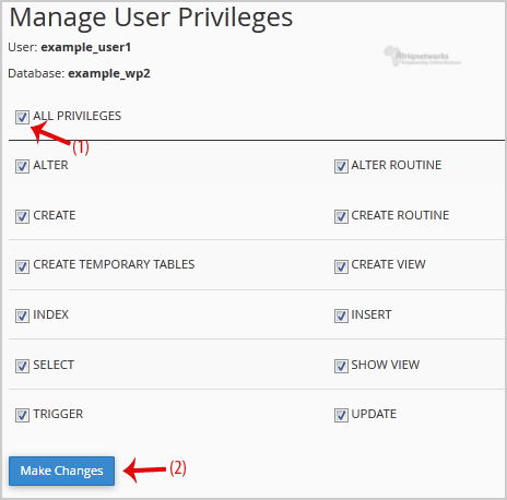Knowledgebase Categories Backup/Restore 4 Broadband Internet 1 cPanel - Control Panel 24 Databases 11 Dedicated Servers 3 DNS - Nameserver 6 Domain 2 Domain Management 10 Domain Transfer 1 Email 13 FTP 4 Installing a Control Panel 6 Mail Filters & SPAM 8 Mobile 11 New Microwave Upgrade 1 Others 3 Security 10 Softaculous 71 Web Hosting 1 Wordpress 17 Categories Backup/Restore (4) Broadband Internet (1) cPanel - Control Panel (24) Databases (11) Dedicated Servers (3) DNS - Nameserver (6) Domain (2) Domain Management (10) Domain Transfer (1) Email (13) FTP (4) Installing a Control Panel (6) Mail Filters & SPAM (8) Mobile (11) New Microwave Upgrade (1) Others (3) Security (10) Softaculous (71) Web Hosting (1) Wordpress (17) How to add a user to a database and add privileges? 1. Log into your cPanel account.2. In the "Databases" section, click on "MySQL Databases" Icon. 3. Scroll down to the end of the page and under "Add User to Database", select a user from the dropdown list, and then choose a Database from the list.4. Click on the "Add" button.5. On "Manage User Privileges", mark the box "ALL PRIVILEGES" and click on "Make Changes". Was this answer helpful? Yes No Print this Article Also Read How to rename a database in cPanel? 1. Log into your cPanel account.2. In the "Databases" section, click on "MySQL Databases"... How to Repair database via phpMyAdmin in cPanel? 1. Log into your cPanel account.2. In the "Databases" section, click on "phpMyAdmin" Icon. 3. In... How to Create a Database Username in cPanel? 1. Log into your cPanel account.2. In the "Databases" section, click on "MySQL Databases"... How to optimize database via phpMyAdmin in cPanel? 1. Log into your cPanel account.2. In the "Databases" section, click on "phpMyAdmin" Icon. 3. In... How to export database table via phpMyAdmin in cPanel? 1. Log into your cPanel account.2. In the "Databases" section, click on "phpMyAdmin" Icon. 3. In... Powered by WHMCompleteSolution Support My Support Tickets Announcements Knowledgebase Downloads Network Status Open Ticket