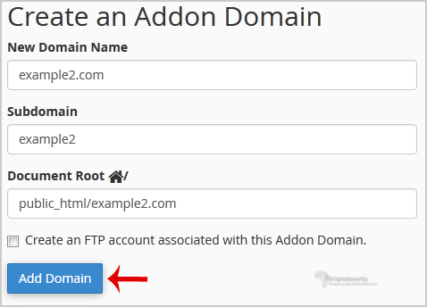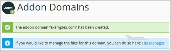 Knowledgebase Categories Backup/Restore 4 Broadband Internet 1 cPanel - Control Panel 24 Databases 11 Dedicated Servers 3 DNS - Nameserver 6 Domain 2 Domain Management 10 Domain Transfer 1 Email 13 FTP 4 Installing a Control Panel 6 Mail Filters & SPAM 8 Mobile 11 New Microwave Upgrade 1 Others 3 Security 10 Softaculous 71 Web Hosting 1 Wordpress 17 Categories Backup/Restore (4) Broadband Internet (1) cPanel - Control Panel (24) Databases (11) Dedicated Servers (3) DNS - Nameserver (6) Domain (2) Domain Management (10) Domain Transfer (1) Email (13) FTP (4) Installing a Control Panel (6) Mail Filters & SPAM (8) Mobile (11) New Microwave Upgrade (1) Others (3) Security (10) Softaculous (71) Web Hosting (1) Wordpress (17) How to Create Addon Domains? Before adding an Addon Domain name you need to point your addon domain name server to your main domain name server and you will need to wait for domain propagation. It usually takes between 12 and 24 hours.1. Log into your cPanel account.2. In the "Domains" section, click on "Addon Domains" Icon. 3. Under the "Create an Addon Domain" option you should enter your addon domain name, username, and password.New Domain Name: Your Addon domain name like example2.comSubdomain: It will be automatically filled in by cPanel.Document Root: It will be automatically filled in by cPanel.Password: Enter a new password or use the "Password Generator" button.4. Click on the "Add Domain" button.If the domain is successfully added, you will receive a message like this. Was this answer helpful? Yes No Print this Article Also Read How to Remove a Subdomain in cPanel? 1. Log into your cPanel account.2. In the "Domains" section, click on "Subdomains" Icon. 3.... How to Redirect an Add-on Domain? You can redirect your add-on domain to another domain.1. Log into your cPanel account.2. In the... How to Remove an Add-on Domain? 1. Log into your cPanel account.2. In the "Domains" section, click on the "Addon Domains" icon.3.... How to Remove Parked Domain name in cPanel? 1. Log into your cPanel account.2. In the "Domains" section, click on "Parked Domains"... How to Create a Subdomain in cPanel? 1. Log into your cPanel account.2. In the "Domains" section, click on "Subdomains" Icon. 3. Under... Powered by WHMCompleteSolution Support My Support Tickets Announcements Knowledgebase Downloads Network Status Open Ticket
